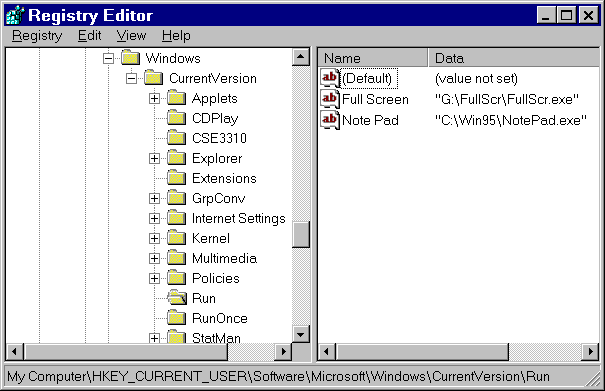 (4)我没有安装RealPlayer,但我相信它和许多软件一样是通过修改注册簿(registry)来实现这一功能的。你可以使用RegEdit修改注册簿(如下图所示),在HKEY_CURRENT_USER\Software\Microsoft\Windows\CurrentVersion\Run下,你可以添加自己的软件。具体的方法是在这个主键(key)下新建一个串值(string),该串值的名字是无所谓的,数据部分是你要运行的软件的名字(最好使用全路径)。这样,每次Windows