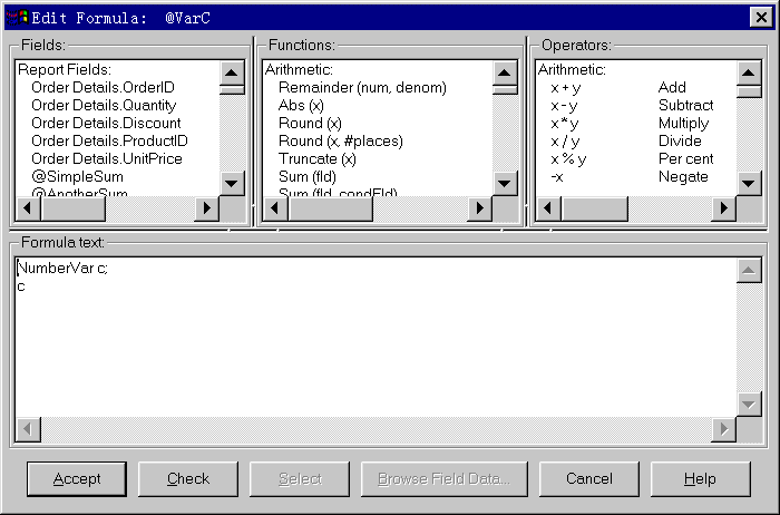 Report.FormulaFields(FindField("@VarC")).Text = _