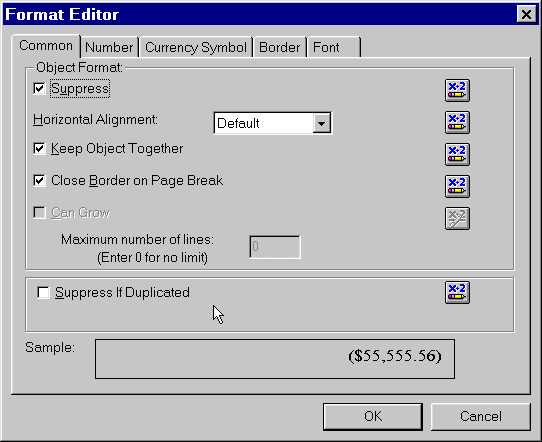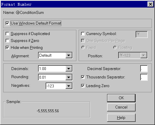 右击ConditionSum公式字段,选择Change Format,设置打印格式。在Crystal Reports 4.6的Format对话框中选择Hide when printing,这样该字段不会在打印时显示出来(图5)。如果使用Crystal Reports 6.0,应该选择Format对话框中的Suppress项(图6)。这是一个非常重要的技巧,有时我们使用公式并不是为了打印公式结果,而只是为了进行方便计算,页可以利用这个办法避免中间计算结果被打印。右击ConditionSum公式字段,在快捷菜单选择Insert Subtotal,这样我们就可以对每组中满足条件的记录进行求和。