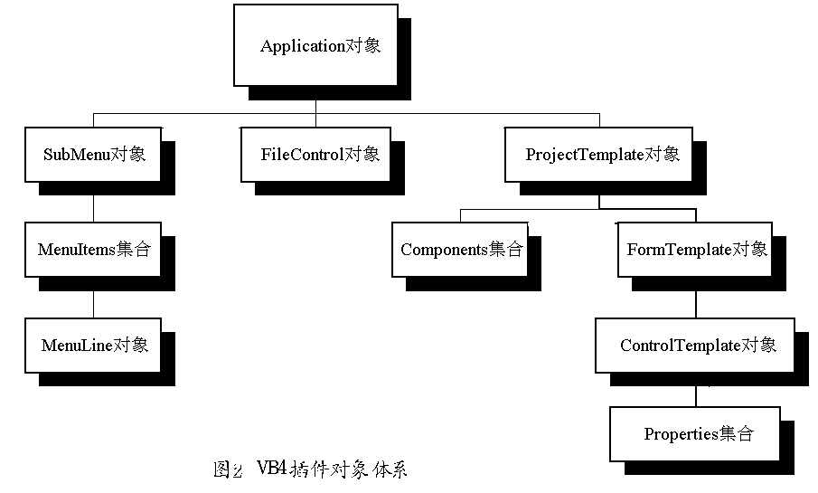 VB 4 . 0 提 供 的 对 象 和 集 合 分 为 几 个 层 次 ( 图 2 ) 。 最 高 层 为 Application对 象 , 它 表 明 调 用 插 件 的 VB 4 . 0 实 例 。 在 同 一 时 刻 , 插 件 必 须 先 获 得 这 个 对 象 , 然 后 才 能 访 问 插 件 API。 插 件 通 过 SubMenu对 象 在 VB 4 . 0 的 IDE的 Add ins菜 单 中 增 加 自 己 的 菜 单 项 。 一 般 的 插 件 总 是 用 来 完 成 两 类 工 作 , 一 类 是 控 制 VB IDE的 文 件 I/ O, 另 一 类 是 操 纵 正 在 编 辑 的 项 目 、 窗 体 和 控 制 。 插 件 通 过 建 立 同 FileControl对 象 的 连 接 可 以 响 应 各 种 与 文 件 操 作 有 关 的 事 件 。 例 如 , 每 当 用 户 要 调 一 个 文 件 到 IDE中 时 , 插 件 可 以 告 诉 VB 4 . 0 应 先 做 什 么 工 作 。 Application对 象 有 一 个 ActiveProject属 性 , 它 是 个 ProjectTemplate对 象 , 表 示 当 前 在 IDE中 编 辑 的 工 程 文 件 ( . VBP) , 通 过 该 对 象 可 以 访 问 工 程 文 件 中 的 所 有 窗 体 文 件 、 代 码 文 件 ( . BAS) 、 类 模 块 文 件 ( . CLS) 和 资 源 文 件 ( . RES) 。 通 过 FormTemplate对 象 可 以 访 问 窗 体 的 属 性 及 其 内 各 控 制 的 属 性 。